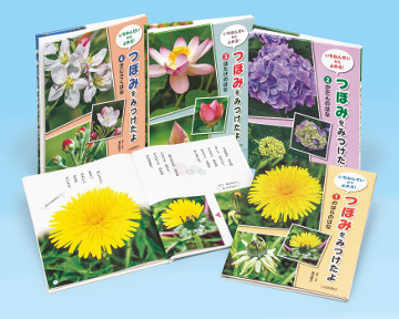 「つぼみ」に対応している本はたくさんありますが、先生や司書さんから「内容が難しすぎる、語彙がならう子どもが読むことができない」などの声が多く見受けられました。ひらがなのみ、文字量少なめと、小学1年生が自分で読めることを念頭においた絵本になっています。つぼみは時系列にそって咲く様子を紹介しています。 |